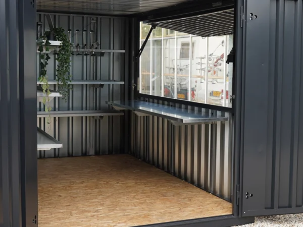 Ergänzen Sie Ihren Container mit praxisbewährtem Zubehör: Fenster- und Türvarianten, Elektro-Grundinstallation, LED-Beleuchtung, Regale, Bodenbeschichtungen, Sicherheits und Schließsysteme sowie Lackierungen in Firmenfarbe.