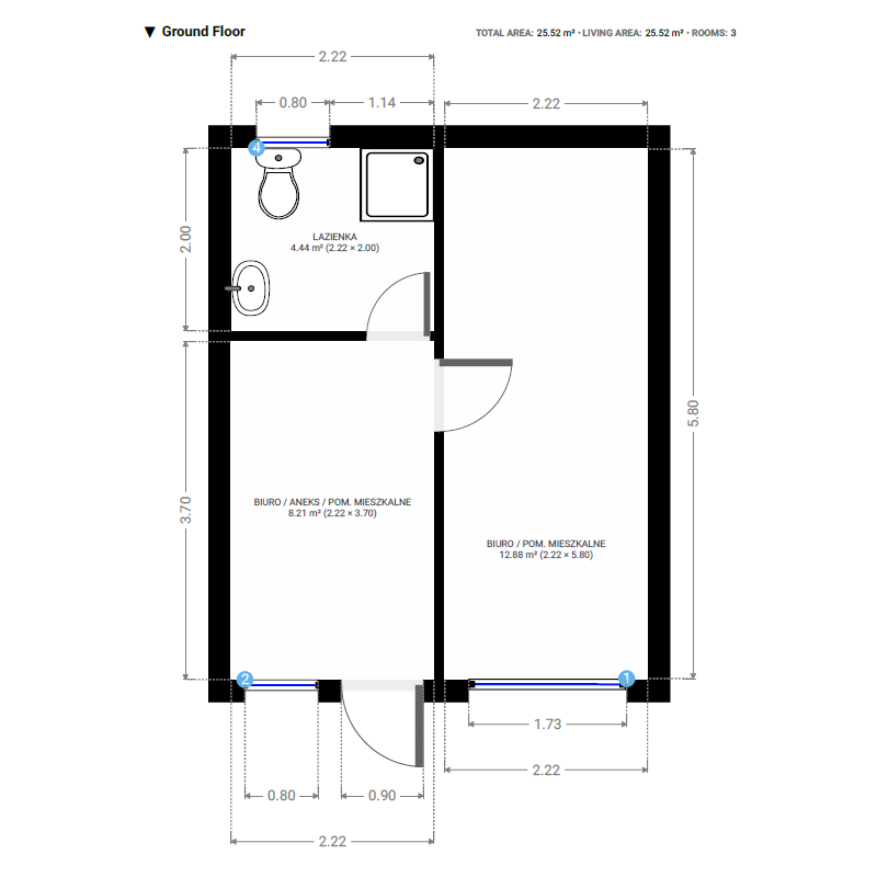 Modul 2: 15 m² Einzelbüro plus separater Sanitärbereich (2,5 × 1,2 m).