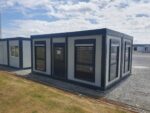 Bürocontainer mit btf. Fenstern 30 m² – neuer Bürocontainer mit bodentiefen Fenstern, ca. 30 m², ideal als lichtdurchflutetes Büro oder Verkaufsraum