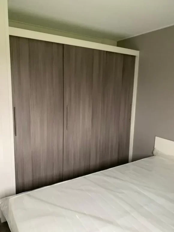 Großes Schlafzimmer: Mit Doppelbett, Einbauschrank mit Schiebetüren und Nachttisch.