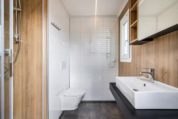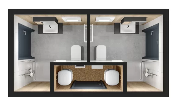Hochwertiges Sanitärimodul – Stahlchassis, 2 Bäder, 8,2 m² Wohnfläche, 4,41 x 2,41 m, sofort lieferbar