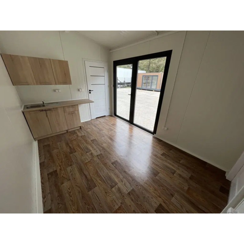 Neues Tiny House 24 m² (8 × 3 m): Wohnküche, separates Schlafzimmer, komplettes Bad, 2 Dreh-Kipp-Fenster, 2 Terrassen-Schiebefenster, elektr. Fußbodenheizung, 80 l Warmwasserboiler, PVC-Boden, wartungsfreie Kunststoff-Fassade. Stahlrahmen, hochgedämmt, selbsttragend – auf Stützpunkten sofort bewohnbar, ohne Baugenehmigung.