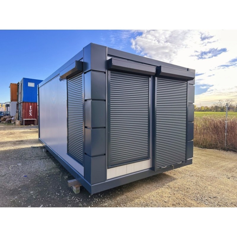 Container komplett montiert inkl. Rolläden, Fenster, Türen, Boden, Regenrinne und CE-Konformitätserklärung. Ohne Fundament, ohne Elektro-Material, ohne Innenausstattung.