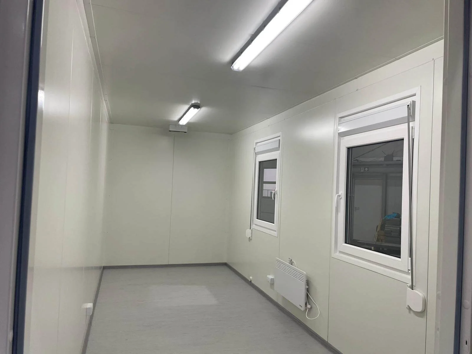 Werksneuer 20-Fuß-Raumcontainer (6,06 × 2,44 × 2,80 m), vollisoliert (Boden/Dach 100mm, Wände 80mm). Ausgestattet mit Stahltür, 2 großen PVC-Fenstern mit Außenrolladen, Elektroheizung 2,0kW, LED-Beleuchtung, Steckdosen & CEE-Anschlüssen. Bodentragfähigkeit 200 kg/m², ideal als Büro oder Werkstatt.