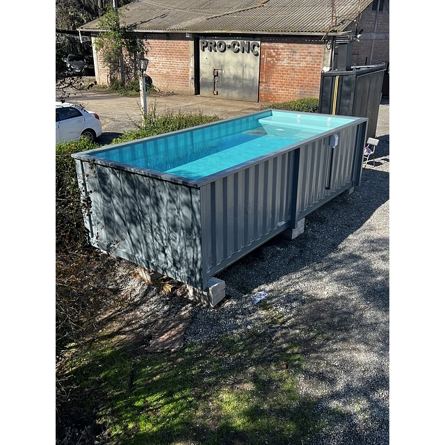Moderner Container-Pool mit 11,8 m Länge, ausgestattet mit Glasfaserbecken, Spa-Jacuzzi (3,0 × 2,5 m) und robuster verzinkter Stahlstruktur. Komplettes Filtersystem, Skimmer und Wasserpumpe inklusive. Ideal für Garten, Hotelanlagen oder Ferienimmobilien.