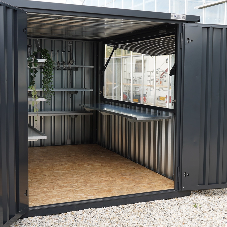 Container Bar XL 3×2 m RAL 7016 Anthrazit – Verkaufscontainer mit Klappöffnung und Doppeltür – Modular