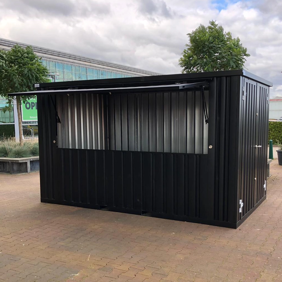 Container Bar 4×2 m RAL 9005 Schwarz – Zerlegbarer Verkaufscontainer mit Doppeltür und Klappöffnung