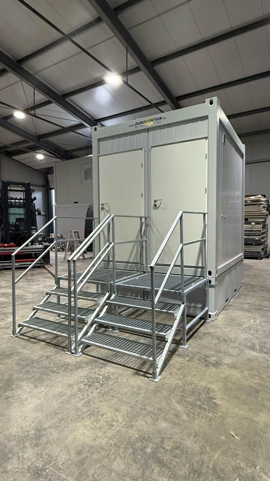 Hochwertiger Sanitärcontainer in kompakter Stahlrahmenbauweise (2,98 × 2,43 m). Modular erweiterbar, CE-geprüft, 200 kg/m² Bodenbelastbarkeit, energiesparende 2-fach-Isolierung, Oszillier-Drehkippfenster und Stahlaußentür in RAL 7016. Fertig montiert, sofort einsatzbereit – ideal für Baustelle, Event oder Werkhof.